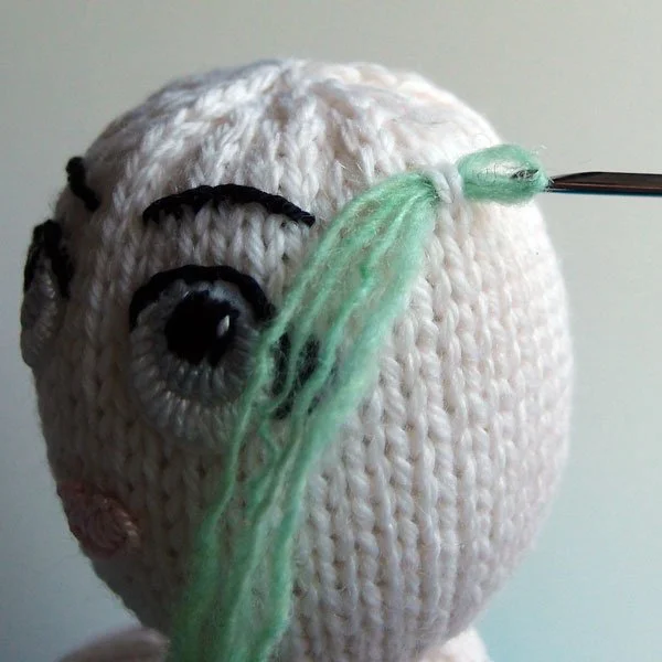 If the yarn is fine, you can hold two strands together, otherwise, work with single strands. Your crochet hook should be large enough to be able to hook the yarn easily, but small enough to be able to go through the knit stitches on the head without stretching them out of shape. Insert the crochet hook into a knit stitch, fold a strand in half, place the loop on the hook, then pull the loop through the knit stitch.