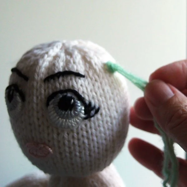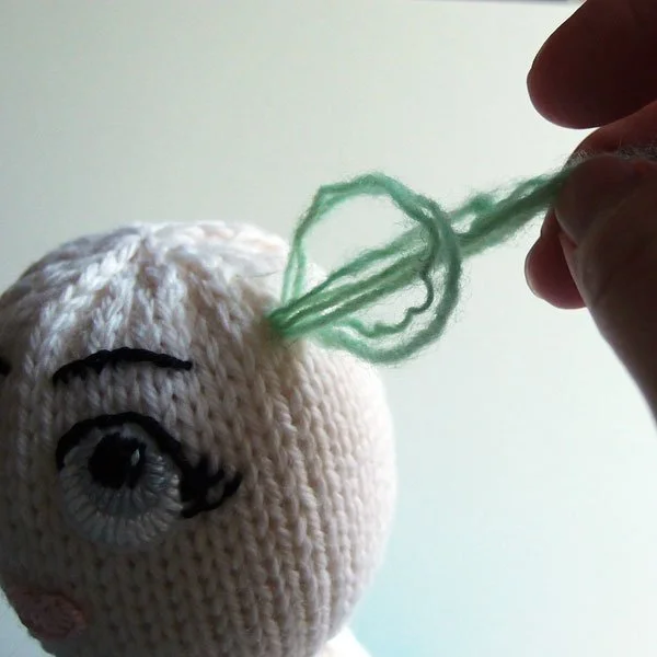 Make a row of knots all around the head. You can use the head stitches to help you keep the row of knots straight and to place them evenly–about every 2 or 3 stitches. Be careful not to put the hair too close to the face. Skip down two rows of head sttiches and make another row of knots. At this point, your doll’s hairstyle should resemble a monk’s.